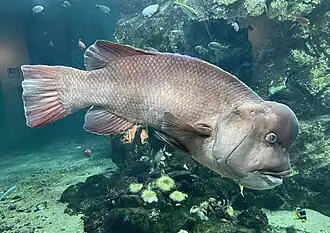 The Asian sheephead wrasse is one of the largest labrid species found in the waters of the western Pacific, reaching a weight of around 14.7 kg (32 lb) and a length of 100 cm (39 in). The body is globiform and bulky, and males are typically larger than females. The mouth is terminal, consistent with the fact that this fish is usually present in the middle of the water column, and prefer to eat prey directly in front of them or beneath them. This fish has hard tooth-like structures present in the mouth, which are excellent for crushing crustaceans.[4][7][8][9] The caudal fin is truncate.