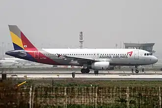 Asiana Airlines Flight 162 was a regular short-haul international passenger flight from Incheon International Airport near Seoul, South Korea, to Hiroshima Airport in Hiroshima, Japan.[1] On 14 April 2015, the Airbus A320-232 aircraft touched down short of the runway, struck the localizer array, skidded onto the runway on its tail, and spun 120 degrees before finally coming to a rest on the grass, opposite the terminal building. The aircraft suffered substantial damage to the left wing and engine. Of the 82 people aboard, 27 occupants (25 passengers and 2 crew) were injured, one seriously.[2][3][4]