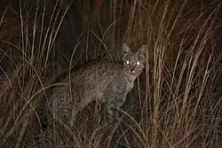 In India, the Asiatic wildcat inhabits the Thar Desert and is associated with scrub desert.[19] In 1999, it was still reported as common in the Rajasthani districts of Bikaner, Barmer, Jaisalmer, Pali and Nagaur.[20] Only four sightings were reported in the Thar Desert between 1999 and 2006.[21] It has been recorded in Nauradehi Wildlife Sanctuary,[22] in Madhya Pradesh and Mirzapur forests.[23]