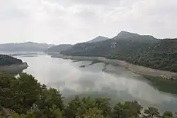 Partly on the western and eastern banks of the dam reservoir, the Karatepe-Aslantaş National Park is located. On a peninsula at the west bank, the hill Karatepe is situated inside the national park. Overlooking the dam reservoir, a walled settlement of the Neo-Hittites was discovered on Karatepe dating back to the 8th century BC. Following archaeological excavations between 1946 and 1952, the site was preserved as the Karatepe-Aslantaş Open-Air Museum in 1958. The Kumkale on Domuztepe, another settlement of the Neo-Hittites and a fortification built by the Crusaders, which is located about 2 km (1.2 mi) north of this site, was flooded by the dam reservoir.[2]