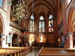 Inside, the church ceiling consists of brick vaults. Of the furnishings, perhaps the most unusual is the bronze baptismal font that belonged to the original, medieval church. The baptismal font dates from the 15th century and was made in northern Germany; it is the only medieval bronze font known from Skåne. The altarpiece is a copy of Thorvaldsen's Christus, and also comes from the old church, where it was installed in 1859. The wooden pulpit dates from the construction period of the church and is decorated with motifs symbolising the Old Testament on one side, and the New Testament on the other. The stained glass windows in the choir, made by artist Reinhold Callmander in Gothenburg, show scenes from the life of Christ in the central panels, while the outer panels display the Four Evangelists and their symbols. The present pipe organ dates from 1974 but its facade is contemporary with the church building.[1][2][3]