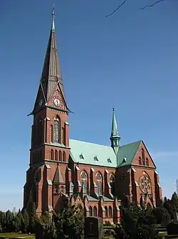 A stone church was first built on the site of the present-day church as early as the 12th century. The medieval church was richly decorated with frescos. In the early 19th century, it was considered too small for the congregation, and it was substantially enlarged and altered between 1843 and 1846, partially to designs by Carl Georg Brunius. In 1869, however, a proposal was put forward to build an entirely new church to house the ever-growing congregation. In 1888 the parish announced an architectural competition for the design of a new church, specifying that the designs should be in the Neo-Gothic style. Although the winner of the competition was architect Axel Anderberg, the church council decided to go ahead with the designs submitted by Hermansson instead, probably because his proposal was deemed to be cheaper to build. The old church was demolished in 1895 and the present building erected in 1895–1897.[1][2][3]