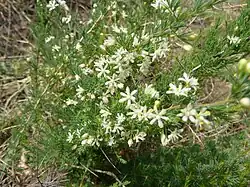 A perennial erect to spreading shrub, reaching 1 metre (3.3 ft) in height. The stems are brush-like, zig-zagged and end in spines. The stem surface is smooth or faintly downy. In colour, the stems are brown to pale cream or grey.