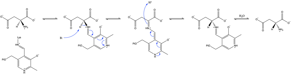 Mammalian aspartate racemase, in contrast with bacterial aspartate racemase, is a PLP-dependent enzyme. The exact mechanism is unknown, but it is hypothesized to proceed similarly to mammalian serine racemase as below: