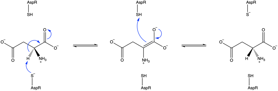 Aspartate racemases in bacteria function in the absence of PLP, suggesting a PLP-independent mechanism.[5] A two-base mechanism is supported in the literature, carried out by two thiol groups: