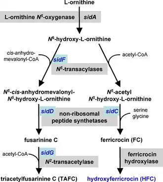 - ^ Haas H (September 2003). "Molecular genetics of fungal siderophore biosynthesis and uptake: the role of siderophores in iron uptake and storage". Applied Microbiology and Biotechnology. 62 (4): 316–30. doi:10.1007/s00253-003-1335-2. PMID 12759789. S2CID 10989925.