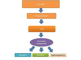 The lifecycle of filamentous fungi including Aspergillus spp. consists of two phases: a hyphal growth phase and a reproductive (sporulation) phase. The switch between growth and reproductive phases of these fungi is regulated in part by the level of secondary metabolite production.[41][42] The secondary metabolites are believed to be produced to activate sporulation and pigments required for sporulation structures.[43] G protein signaling regulates secondary metabolite production.[44] Genome sequencing has revealed 40 potential genes involved in secondary metabolite production including mycotoxins, which are produced at the time of sporulation.[9][45]