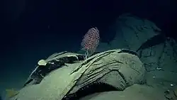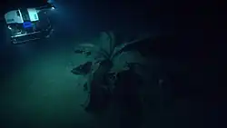 The first asphalt volcanoes were discovered in 2003 by a research expedition to the Gulf of Mexico.[2] They are located on a seafloor hill named "Chapopote," Nahuatl for "tar." The site is located in a field of salt domes known as the Campeche Knolls, a series of steep hills formed from salt bodies that rise from underlying rock, a common feature in the gulf. The research team documented tar flows as wide as 20 m (66 ft) across. Also discovered alongside the asphalt were areas soaked with petroleum and methane hydrate, also spewed from the volcano. This kind of an environment proves attractive to chemical-loving bacteria and tubeworms, although the exact biogeochemical relationship is not yet known.[3]