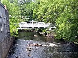 As of 2020 there are nine dams on the Assabet River. Seven dams powered mills: Aluminum City, Allen Street, Hudson, Gleasondale, Ben Smith, Powdermill, and Damonmill / Westvale.[3][13] The Nichols and Tyler dams are modern dams built for flood control. Damonmill Dam is partially breached so it does not retain water, though it slows flow at flood times. A tenth mill dam—Paper Mill Dam in Maynard—was destroyed by the 1927 flood. As of 2020, 39 road bridges, two Assabet River Rail Trail pedestrian and cycle bridges, the Taylor Memorial Bridge (a pedestrian bridge) in Hudson, one abandoned railroad bridge in Hudson, and one active railroad bridge in Concord cross the river.