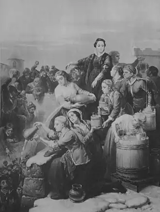 When the Danes tried to enter, they were met by a barricade which had been built by the Swedes, and while they were repelled by the barricade, they were bombarded by two cannons which had been pulled up on a nearby roof which Emerentia loaded with iron shot and old horseshoes. However, she did not satisfy herself with only this, she had, together with the wives of the Swedish knights, make large amounts of boiling lye, which the women poured over the attacking Danes, so that they:[6][3]