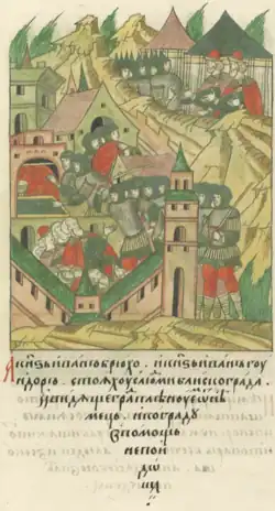 The assault on Ivangorod was a battle fought between the Grand Principality of Moscow and the Kingdom of Sweden at the Russian fortress of Ivangorod in 1496,[1] resulting in the mass plundering of the city and thousands of civilians being killed by the Swedes. It was later burned down because the Swedes lacked resources to defend it.[2][3]