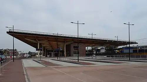 Assen (Dutch pronunciation: [ˈɑsə(n)] ⓘ; abbreviation: Asn) is a railway station located in Assen, Netherlands. The station was opened on 1 May 1870 and is located on the Meppel–Groningen railway. The station is operated by Nederlandse Spoorwegen. A new station building was opened in 2020, featuring a large wooden triangular roof with windows allowing light down to the indoor spaces and platforms,[1] replacing the previous building from 1988. From 1902 until 1947 there was also a railway line to Gasselternijveen, where trains connected to the railway line to Stadskanaal.