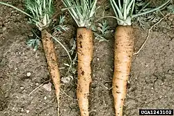 ![]() Symptom range: healthy carrot is on right, seriously damaged carrot on left | |