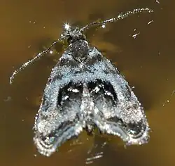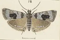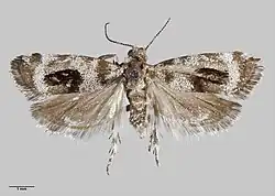 ♂. 10 mm. Head and thorax dark brown. Pace grey. Palpi, second segment with dense rounded descending tuft, grey. Antennae black spotted with white, ciliations in ♂ 3+1⁄4. Abdomen greyish fuscous. Legs dark fuscous, mixed and banded with white. Porewings with costa slightly arched, apex rounded, termen almost straight, oblique; brown; markings formed chiefly by dense white irroration; a small irregular basal patch; a broad band from 1⁄5 to 1⁄2 costa and 1⁄4 to 1⁄2 dorsum, its inner edge slightly incurved and its outer margin irregular; a broad fascia from costa at 3⁄4 to tornus, constricted beneath costa and somewhat excurved; a thin subterminal line white on costa and metallic blue round termen: between second and third fasciae on lower half of wing a large black blotch enclosing two small patches of metallic blue scales: fringes brown, touched with white at tornus and with a darker basal line. Hindwings pale purplish brown, lighter towards apex; a rather obscure white fascia from tornus reaching about half way round termen and keeping close to the margin: fringes brown, more or less white-tipped and with a darker basal line.[3]