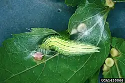The female lays clusters of green eggs. The larva is green with yellow, white, or greenish stripes.