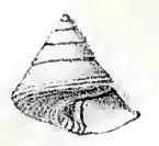 The spire is high and conical. The apex is flattened, with the minute smooth embryonic 1½ whorl slightly projecting. The 6 whorls show a regular and slow increase (but the specimen is not full-grown). The spire is perfectly flat, the slope being scarcely broken by the suprasutural thread. The suture is linear, almost invisible. The aperture is perpendicular, irregularly rectangular, broader than high. The outer lip is sharp and thin, with a slight open sinus. It is sharply angled at the periphery, slightly arched across the base, apparently nicked at the point of the columella. The inner lip is arched, strengthened by a thin pad, reverted on the umbilicus so as to leave a groove behind it, with a slight tooth in front. From the body it bends very much over to the left, so as largely to cover the umbilicus. It then advances straight and is toothed in front. The umbilicus is small, oblique-edged, with a crenulated margin (described as Basilissa munda).[1]