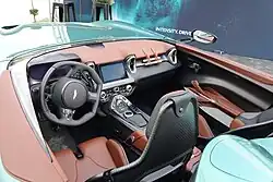 The DBR22 inherits the 5.2-litre V12 engine from the DBS Superleggera and the V12 Speedster and is mated to the ZF8 eight-speed automatic transmission.[5] With that transmission it can accelerate from 0 to 60 mph in 3.5 seconds and reach a top speed of 198 mph (319 km/h).[6][7] Carbon fiber was used to make the DBR22 structure, while the frame supporting the suspension was created as a result of 3D printers.[8] This technology allowed to significantly reduce the total weight of the car without sacrificing rigidity.[9]