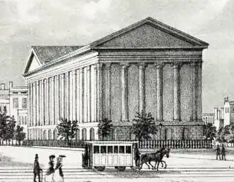 The Astor Opera House, also known as the Astor Place Opera House and later the Astor Place Theatre,[1] was an opera house in Lower Manhattan, New York City, on Lafayette Street between Astor Place and East 8th Street. Designed by Isaiah Rogers (1800–1869), in the Classical Revival style of architecture, inspired by the temples of Ancient Greece and Rome of two thousand years earlier. The theater was conceived by impresario Edward Fry, the brother of composer William Henry Fry (1813–1864), who managed the famed opera house during its entire history.[2][3]