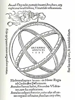 Parts of the instrument go back to instruments made and used by ancient Greek astronomers. Gemma Frisius combined several of the instruments into a small, portable, astronomical-ring instrument. He first published the design in 1534,[2] and in Petrus Apianus's Cosmographia in 1539. These ring instruments combined terrestrial and celestial calculations.[3]