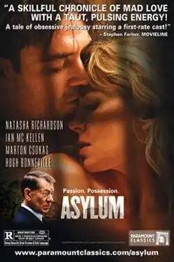 Asylum is a 2005 drama film directed by David Mackenzie and made by Mace Neufeld Productions, Samson Films, Seven Arts Productions, Zephyr Films Ltd and released by Paramount Classics. It is based on the 1996 novel Asylum by Patrick McGrath and was adapted for the screen by Patrick Marber and Chrysanthy Balis.