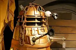 "Asylum of the Daleks" was directed by Nick Hurran, who directed "The Girl Who Waited" and "The God Complex" of the previous series, as well as the fifth episode of the seventh series.[7] "Asylum of the Daleks" contains many of the Dalek types that the Doctor has faced over the years, including the Special Weapons Dalek from the 1988 story Remembrance of the Daleks.[27][28] According to The Daily Telegraph, the production team located the remaining models of the various versions of the Daleks and shipped them to the studios in Cardiff Bay. This included a Dalek owned by Russell T Davies, Moffat's predecessor.[29] Executive producer Caroline Skinner knew Davies well and asked to borrow his replica. She stated that he was "thrilled" that it was canonised.[30] The total number of different Daleks was around 25, with models from 1963 to 2010; Skinner said that "there was just a real magic and sense of history about having them".[31] Moffat was concerned about how all the different Daleks would look together, but was pleased once he saw them; he commented that the diversity made them look like a species, rather than identical robots.[7] Many of the props were built from scratch.[32] The snow scenes on the asylum planet were filmed in Spain during the production of "A Town Called Mercy".[7] Music featured in the episode are the "Habanera" from the Georges Bizet opera Carmen, which is used diegetically,[33] and "Feel the Love" by Rudimental is also featured.[34] The Doctor Who logo in the title sequence featured the texture of a Dalek,[8] in keeping with the varied "blockbuster" themes for each of the opening titles of the first half of the series.[35]