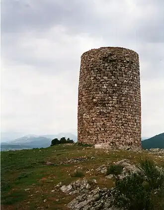 The Watchtower of El Berrueco has a circular layout and resembles a tree trunk due to the irregularities in its cylindrical shape. The structure was built in ashlar, but the ground floor is solid stone. The tower is accessible through the second floor, where the door is situated, approximately 2.25 m (7 ft 5 in) above the ground.