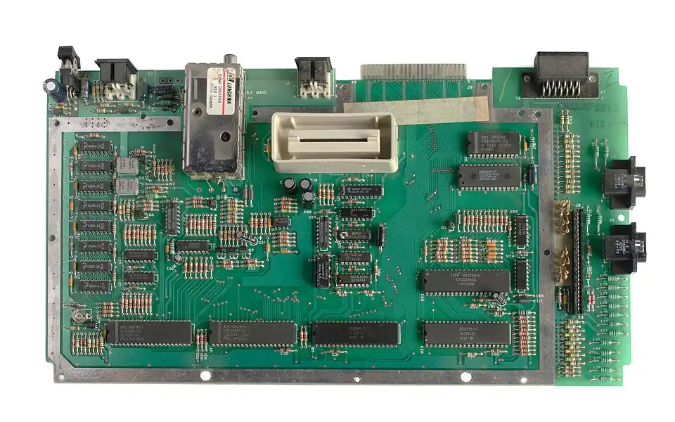 The Atari 800XL’s electronics are housed on a single board, including peripheral connectors and an external system bus for expansions.