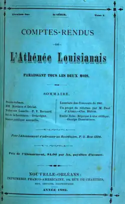 The Athénée Louisianais (est. 1876) was a francophone literary society in New Orleans, Louisiana. Founding members were P. G. T. Beauregard, Oliver Carrière, Paul Fourchy, J. G. Hava, Auguste Jas, Sabin Martin, Alfred Mercier, Armand Mercier, Léona Queyrouze, and Charles Turpin.[1] It published a magazine, Comptes-Rendus de l'Athénée Louisianais, and began an essay contest in 1878.[2] It organized lectures by Eugène Brieux, Hughes Le Roux, Henri de Régnier, and Firmin Roz, among others.[2] Around 1913 the group operated from headquarters in the Hibernia Bank Building on Gravier Street.[3] As of 1929 it belonged to the Fédération de l'Alliance française.[2]