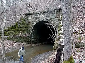 ![]() An historic stone stream culvert under a causeway created over a century ago for the former B&O Railroad, in Troy Township, Athens County, Ohio, USA. | |
