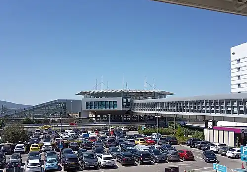 The railway station is immediately adjacent to the airport terminal, accessible by an elevated walkway. Because of the additional cost of using the station, there is a surcharge for passengers entering or exiting the airport. As of 2023, the base fare to the airport is €9, with varying prices for round trips or groups.[5]