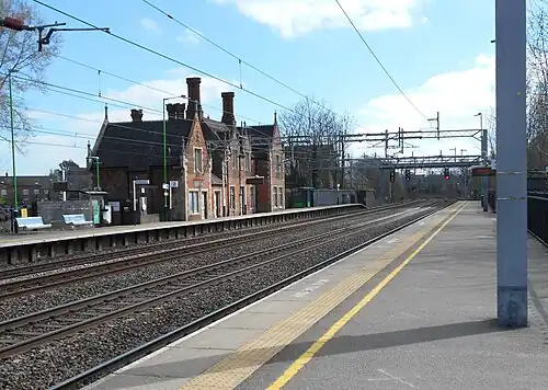 The station was designed by John William Livock and opened by the London and North Western Railway in 1847. The line through the station was originally double track, but was widened to quadruple track during 1901-1909. The original down (northbound) platform was demolished and replaced by the current one during this time to accommodate the extra tracks.[1] It was absorbed by the London Midland and Scottish Railway in the Grouping of 1923. The station passed to the London Midland Region of British Railways on nationalisation in 1948. When British Rail introduced sectorisation in the 1980s, the station was served by the Regional Railways until the privatisation of British Rail.