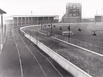 After the war, the circuit was 428 yards (391 m) in circumference with long 125 yards (114 m) straights and a good run-up, but bends were described as very sharp. The Outside M.S Cable hare system was in operation with distances of 280 yards (260 m), 500 yards (460 m) and 650 yards (590 m) being used.[6] The north covered stand was called the popular enclosure with a licensed club next to it, and there was also a smaller south covered stand with an enclosure separating a further covered popular enclosure and licensed club. The hare control was usually between the first and second bends, but the small judge's box was directly next to the winning line.[6] The racing kennels were well back behind a third covered popular enclosure on the third bend, and the 250 resident kennels were situated in countryside surroundings at Trentham, 7 miles (11 km) from the stadium.[6]