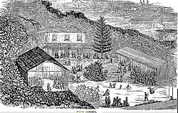 - "The hotel is about 45 feet frontage with a verandah nearly the whole length resting on plain white painted pillars. There is a well-furnished large parlour also a dining and sitting room. There are two saloons for dancing of wood with sloping roofs of shingle, one 100 feet by 25, the other 52 feet by 22 with apertures left on each side about 5 feet square in place of windows. The hotel is plastered over and painted white."[7]
