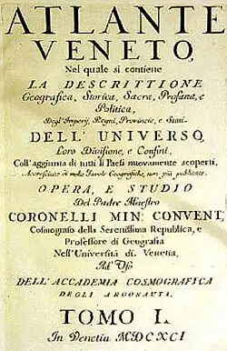 Atlante Veneto (1690–1701) was a comprehensive atlas published by the Franciscan geographer Vincenzo Maria Coronelli and intended as a continuation of the Blaeu Atlas Maior. This monumental work was published in thirteen folios and provided a wealth of detail covering ancient and modern cartographers and geographers, together with astronomical and historical data. These maps were engraved in a bold style and printed on fine white paper, the more important ones spread over two sheets, allowing for great detail.