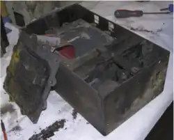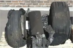 Most of the fuselage was destroyed in the fire.[16] Exceptions included the nose and the underside of the cockpit. The tips of the wings and ailerons were nearly undamaged. The front wing spar was sufficiently intact that it was able to keep the wings together. The inner parts of the wing, including the spoilers, were destroyed, but two of the spoiler actuators were salvageable.[23] The tail was largely intact. Most light alloy components in the engines were destroyed, although the compressor blades were intact and showed no sign of damage prior to impact.[24] Three components – the left main landing gear, an engine cowling and the outer right engine – were found between the runway and the wreckage, and had not been consumed in fire.[16]