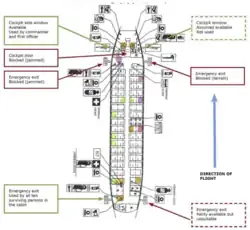 The aircraft landed at a site located 46 metres (151 ft) from the end of the runway and 50 metres (160 ft) from the sea.[16] Once the aircraft had come to a halt, the pilots turned off the fuel supply and activated the engine fire extinguishers. They were not able to order evacuation by intercom, as it was not functioning.[17] The forward starboard door could not be opened due to a jam, while the cockpit and forward port door were both blocked. The pilots evacuated through the left cockpit window, while all surviving passengers evacuated through the aft port door.[15] The pilots attempted to open the jammed front port door, but failed. The commander then re-entered the cockpit to again attempt to open the cockpit door, but failed. By then the heat hindered further attempts. Both pilots were seriously injured in the process. The injured were flown to hospital by air ambulance.[17] Several of the passengers sitting close to the front of the aircraft decided to evacuate towards the aft, as that part of the aircraft was more intact.[18]