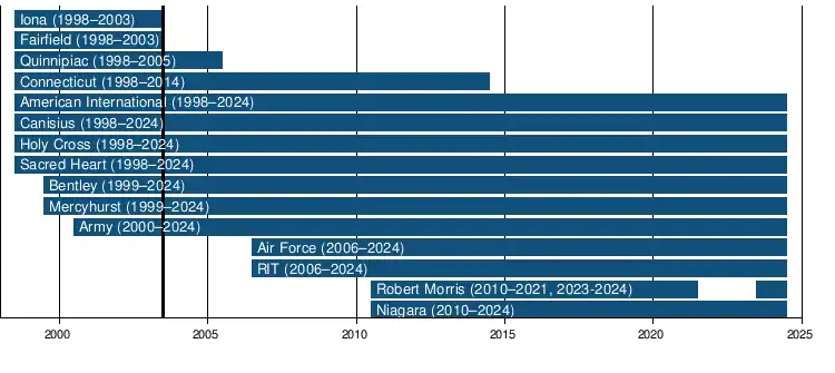 - ^ Robert Morris was a member of Atlantic Hockey from 2010 to 2021 until the program was cut. Subsequent fundraising efforts allowed the program to be reinstated for the 2023–24 season with Robert Morris rejoining Atlantic Hockey.