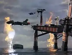 ![]() Thunderbird 2 (left) deploys Thunderbird 4 as the undersea fire threatens Seascape (right). The episode has been praised for its special effects. The Seascape model that appears in the episode was a replacement for the original, which was accidentally destroyed off-camera. | |
