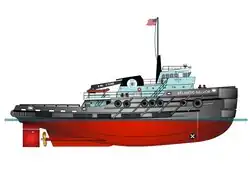 Then named Mister Darby, the boat's construction was completed and she was delivered to Jackson Marine Corporation on 9 February 1997.[1] Her hull, constructed from ordinary strength steel, has an overall length of 42.9 metres (141 ft), a molded breadth of 6.8 metres (22 ft), and a moulded depth of 6.8 metres (22 ft).[1] The boat has a total of 21 tanks: 12 for fuel oil, 5 for ballast water, 5 for lubricating oil, 7 apiece for fresh- and waste-water, a hydraulic oil tank, a slop tank, and an anchor chain locker. The tug can carry up to 6 cubic meters of fuel, has a gross tonnage of 852 GT and a net tonnage of 205 NT.[1]