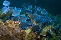 Fish in schooling mode swim fast, eat at intermediate rates, and are not aggressive, even though they are often chased by damselfish.[15] Schooling is most prevalent in areas with high damselfish densities such as the groove zone, spur zone, and crest zone (shallow reef area), while schools are most prevalent near midday.[14] Blue tangs are often seen schooling with midnight parrotfish.[16]