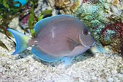 Acanthurus coeruleus is a species of marine ray-finned fish belonging to the family Acanthuridae, the surgeonfishes, unicornfishes and tangs, found in the Atlantic Ocean. It can grow up to 39 centimetres (15 in) long.[3] Common names include Atlantic blue tang, blue barber, blue doctor, blue doctorfish, blue tang, blue tang surgeonfish, yellow barber, and yellow doctorfish.[1]