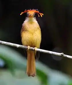 The Atlantic royal flycatcher is 16 to 16.5 cm (6.3 to 6.5 in) long. One specimen weighed 23.5 g (0.83 oz). This large-billed flycatcher has a spectacular, but rarely seen, crest. The upper parts are mostly dull brown with a bright cinnamon rump and tail. It has a whitish throat and ochraceous buff underparts. It has an erectile fan-shaped crest that when raised is scarlet, black, and blue in the male and yellow or orange, black, and blue in the female.[7]