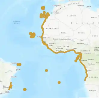 Out of all 106 amphi-Atlantic reeffish, Aulostomus strigosus is one of only four to have migrated from the east Atlantic to the west.[18]