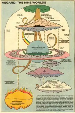 Yggdrasil; the world tree is an immense ash tree that is central to the Asgardian dimension. The tree is supported by three roots that extended far into the other worlds; one to the spring of Hvergelmir in Niflheim, one to the well of Mimir in Jotunheim, and another to the well of Wyrd in Asgard. Though Midgard is not physically connected to Yggdrasil, it is said that the Earth's axis is in alignment with the tree.[31] In the limited series Thor: Blood Oath, Thor and the Warriors Three are sent to retrieve golden apples from the branches of the tree.[33] Odin once hung himself from the tree for nine days and nights as a sacrifice to gain knowledge of the runes. Thor repeated this action during Ragnarök.[34] Later Amora the Enchantress attempt to destroy the tree in an effort to free the body of Skurge the Executioner from its roots, an action that nearly tore apart the fabric of reality.[35]