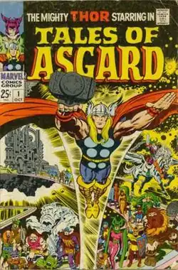 ![]() Asgard and some of the inhabitants of the Asgardian dimension on the cover of Tales of Asgard #1 (October 1968) Art by Jack Kirby. | |