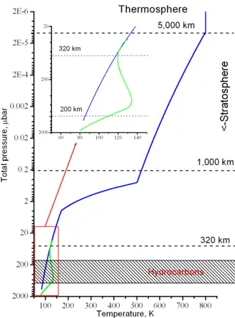 - ^ At these altitudes the temperature has local maxima, which may be caused by absorption of solar radiation by haze particles.[19]