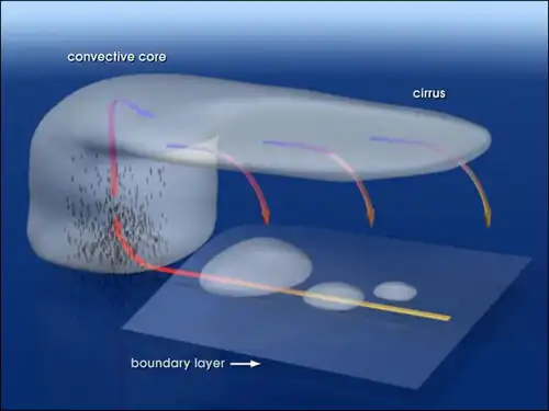 Air is being moistened as it travels toward convective system. Ascending motion in a deep convective core produces air expansion, cooling, and condensation. Upper-level outflow visible as an anvil cloud is eventually descending conserving mass (rysunek – Robert Simmon).