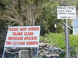 Atokos (Greek: Άτοκος) is a small, uninhabited Greek island in the Ionian Sea off the coast of Acarnania and is one of the most westerly and perhaps remotest of the Echinades Islands.[1][2] As of 2011, it had no resident population.[3] It lies 9 kilometres (6 miles) northeast of Ithaca and 8 kilometres (5 miles) southwest of Kastos, just northeast of the main shipping and ferry channel between Brindisi in Italy and Patras on the Peloponnese. From such large vessels you can get a reasonable view of the southwestern end (narrow aspect) of the island and its steep cliffs. To approach it and land requires a private boat, and safe anchorage is advisable only in calm weather at one of its two key anchorages: One House Bay on the east coast and Cliff Bay on the south coast. The former is the preferred option as it shelters boats from the prevailing northwest winds and has better access to the island via a pebbled beach and small flat hinterland.