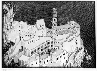 Atrani, Coast of Amalfi is a lithograph print by the Dutch artist M. C. Escher, first printed in August 1931. Atrani is a small town and commune on the Amalfi Coast in the province of Salerno in the Campania region of south-western Italy. Atrani is the second smallest town in Italy and was built right at the edge of the sea. This image of Atrani recurs several times in Escher's work, most notably in his series of Metamorphosis prints: Metamorphosis I, II and III.