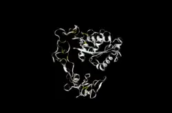 A significant portion of the protein from position 1-190 consists of alpha-helical structures with two shorted helixes between positions 315-340.[6] There are 39 observed disulfide bonds in the protein, all but one of these disulfide bonds occur between positions 157-409. Research suggests that the RSECD cysteine residue at positions 272-276 must be involved in a disulfide bond for the enzyme to have an inhibitory effect on platelet aggregation.[6]